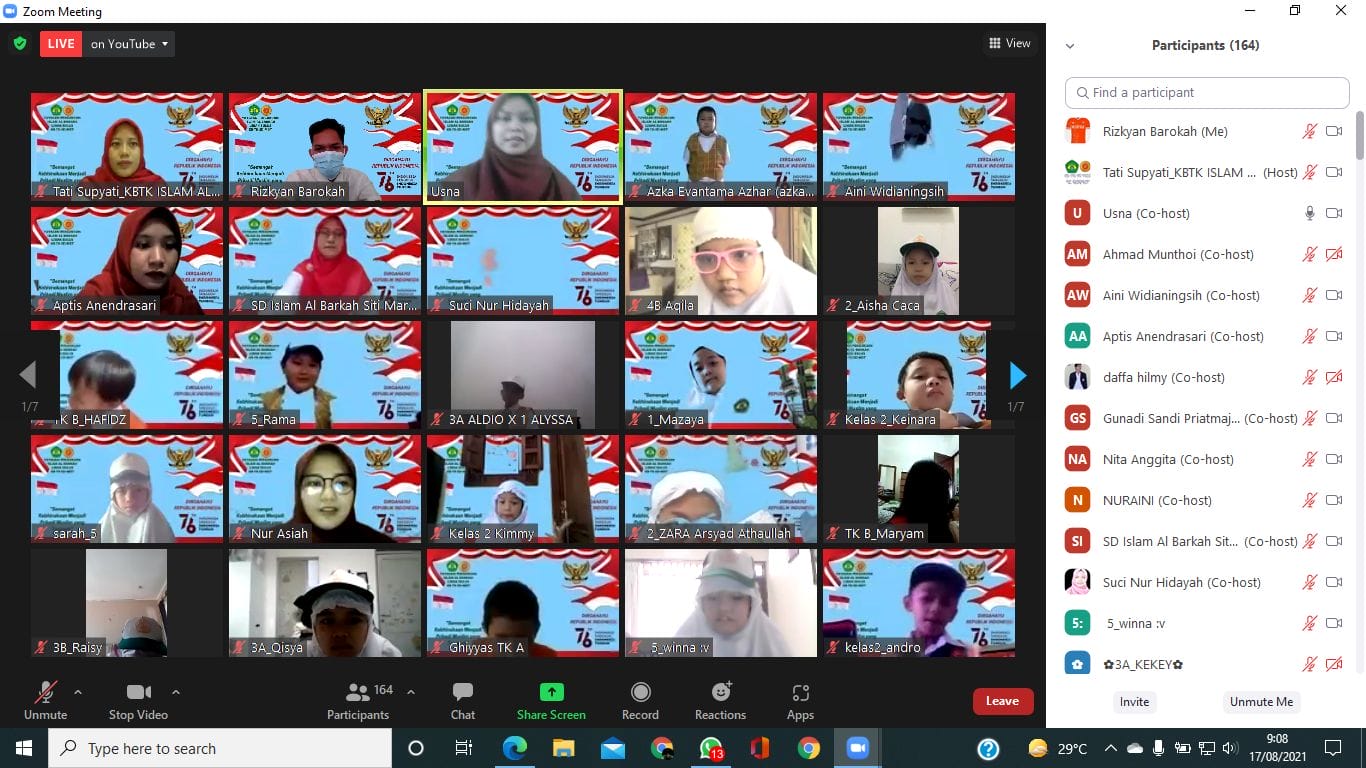 Selasa, 17 Agustus 2021, Yayasan Perguruan Islam Al Barkah merayakan upacara Hari Kemerdekaan Rebuplik Indonesia ke-76 secara virtual atau daring menggunakan aplikasi zoom cloud meeting. Perayaan Hari Kemerdekaan Rebuplik Indonesia ini diikuti oleh: